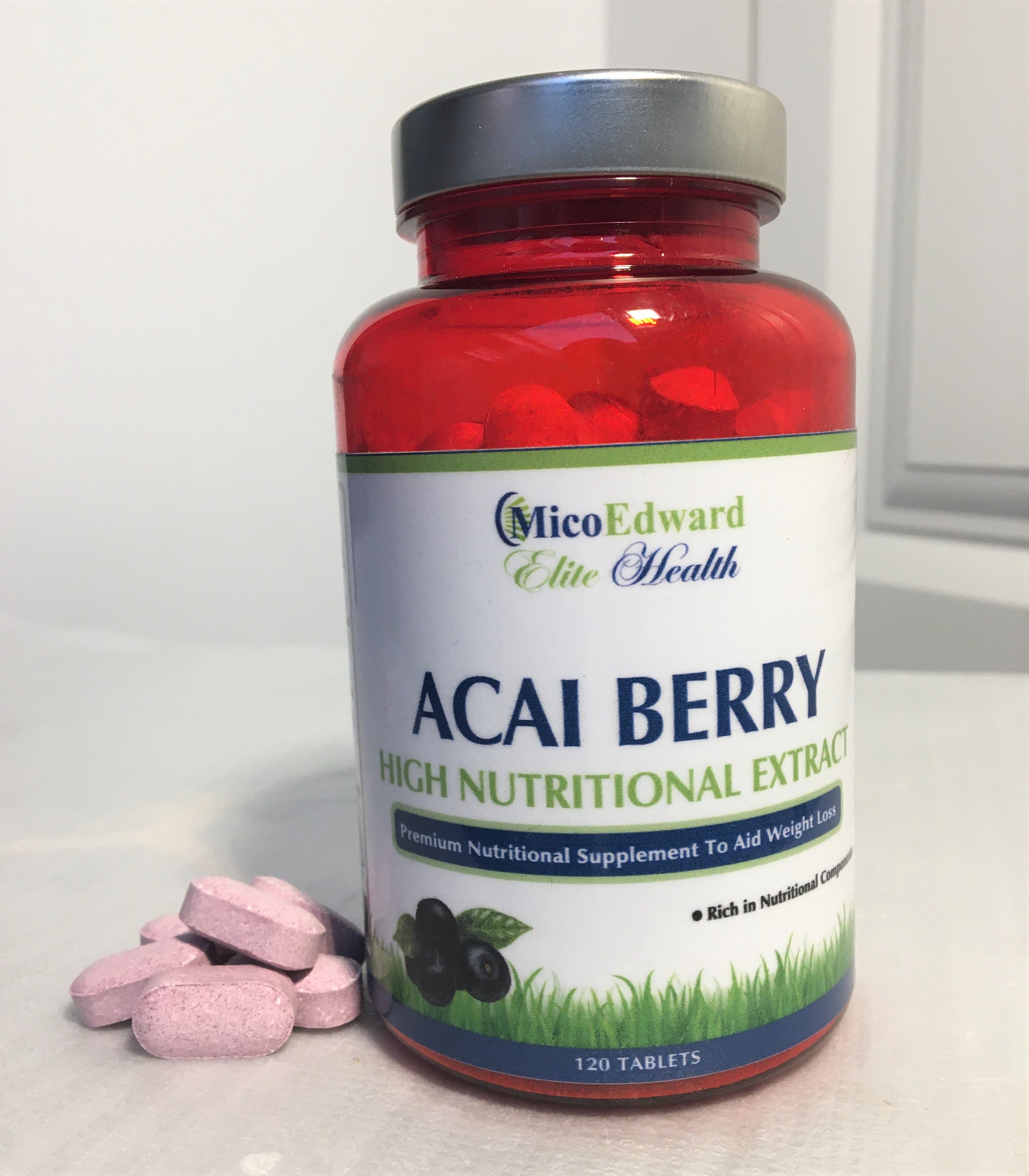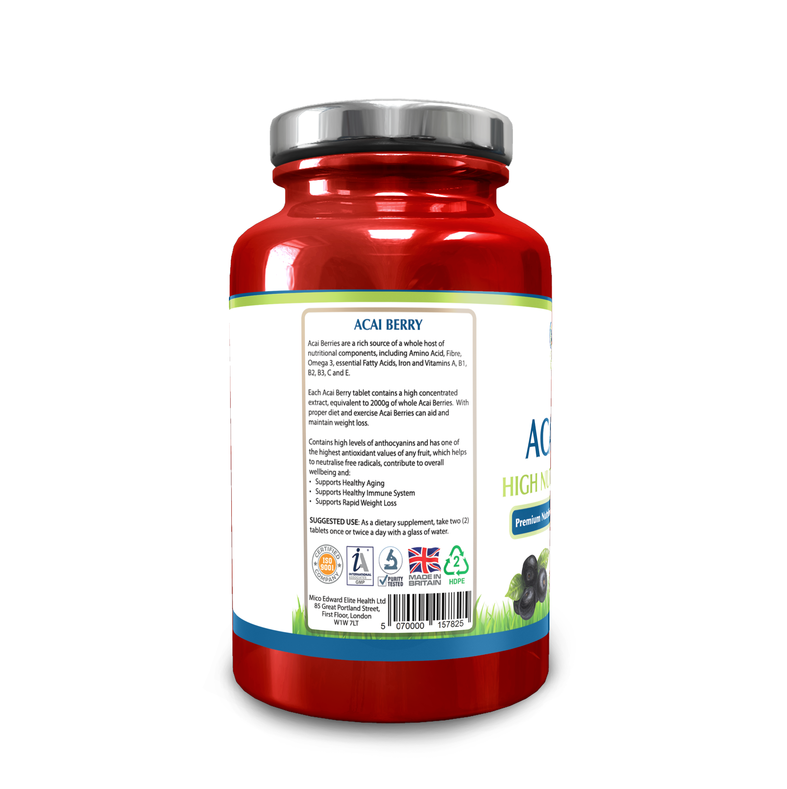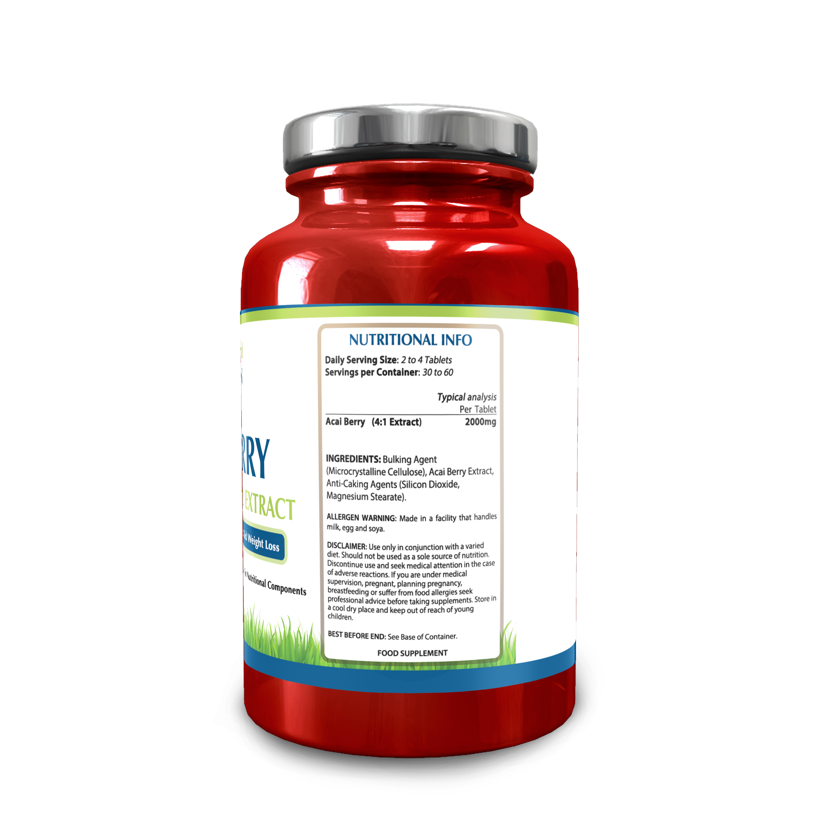 Each Acai Berry tablet contains a rich source of nutritional goodness, including Vitamin A, B1, B2, B3, E, Amino Acid, Fibre, and Omega 3.