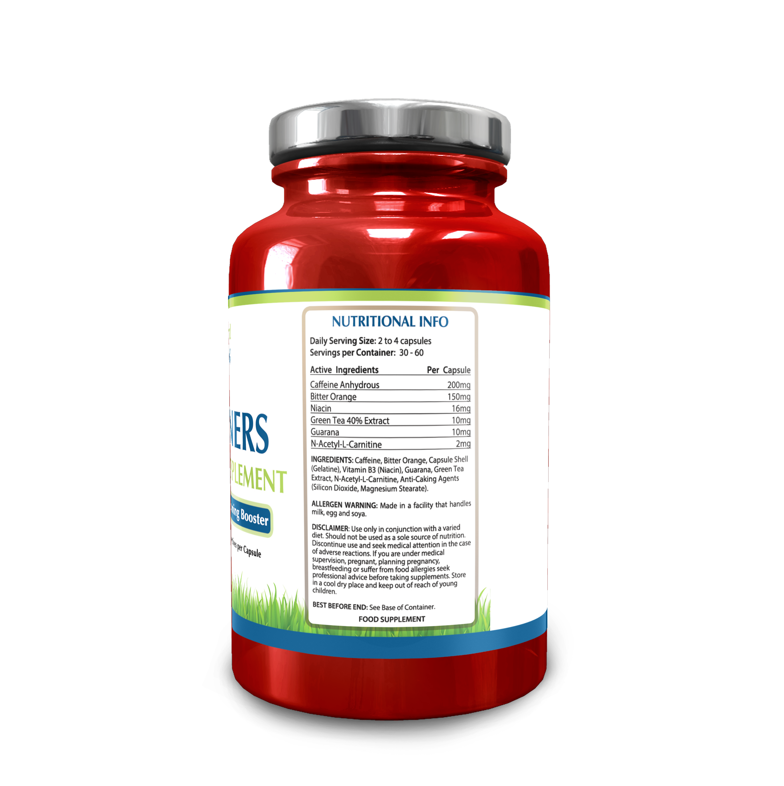 INGREDIENTS: Caffeine, Bitter Orange, Capsule Shell (Gelatine) Vitamin B3 (Niacin) Guarana, Green Tea Extract, N-Acetyl-L-Carnitine, Anti-Caking Agents (Silicon Dioxide, Magnesium Stearate).